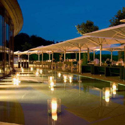 Mit Palazzo M16 lassen sich attraktive Schirmlandschaften gestalten, die Restaurants, Bars oder auch Verkaufsständen eine noble Note verleihen. Beispiel gefällig? Sogar Starkoch Paul Bocuse stellt in Lyon seine Gäste in den Schatten von Palazzo M16.